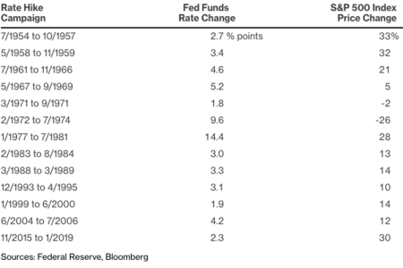 Historically speaking, equities have gone up when rates rise. In most cases the Fed raises rates when the economy is growing too quickly, resulting in higher inflation. Since 1954 the Federal Reserve has had 13 interest rate hiking cycles. The S&P 500 moved higher during 11 of them.